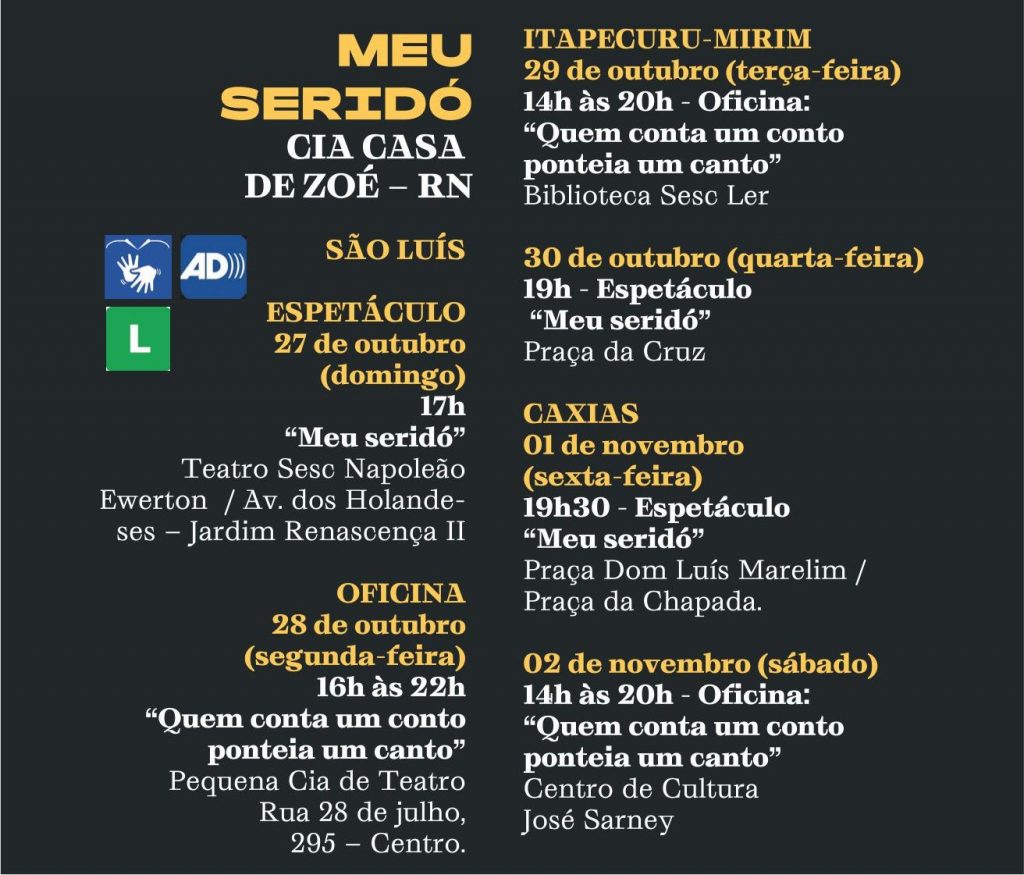 A edição 2019 do Palco Giratório está em sua última temporada no Maranhão. De 24 de outubro a 02 de novembro, São Luís, Itapecuru-Mirim e Caxias recebem o espetáculo “Meu Seridó” da Cia Casa de Zoé (RN), além da Oficina “Quem conta um conto ponteia um canto”, ministrada pelo grupo para artistas locais, e o circuito especial AudiodescriçãoLAB (PE/SC). Toda a programação é gratuita.