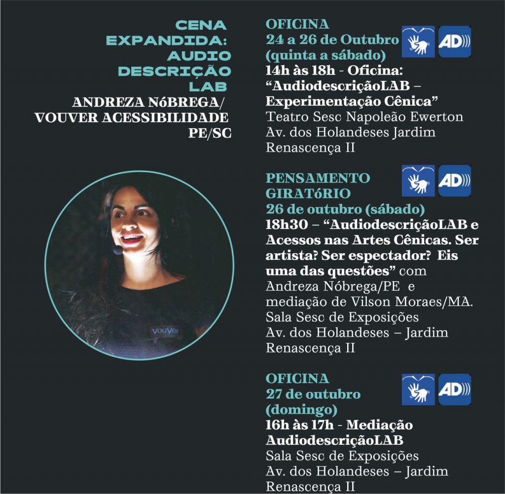 Reunindo 28 participantes, a oficina ministrada por Andreza Nóbrega (PE/SC) de 24 a 26 de outubro, no Teatro Sesc, é destinada a pessoas com deficiência visual e integrantes de movimentos de luta pela acessibilidade. São abertas ao público as programações: Pensamento Giratório, que propõe uma reflexão sobre algumas estratégias de acessibilidade realizadas em cena e para a cena, e a mediação, uma ação para as pessoas espectadoras da audiodescrição uma hora antes da apresentação do espetáculo “Meu Seridó”.