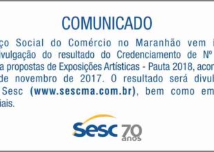 O Serviço Social do Comércio no Maranhão vem informar que a divulgação do resultado do EDITAL DE CREDENCIAMENTO Nº 01/2018 – PROPOSTAS ARTÍSTICO-CULTURAIS PARA AÇÕES DO PROJETO “SESC FOLIA – CARNAVAL DO COMERCIÁRIO”, NAS CIDADES DE SÃO LUIS E RAPOSA foi adiado por motivos técnicos para o dia 25/01/2018. Alteração de data de divulgação de […]